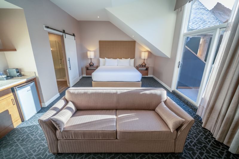 Treat yourself to our Royal King Suite, featuring a king-sized bed, sofa bed, a large 50” TV with satellite channels, and a wet bar with Nespresso coffee. Your luxurious bathroom includes a walk-in rain shower and a deep soaker tub. Unwind on your private balcony and enjoy the northern views of Policeman's Creek and the Lady MacDonald Mountain Range.